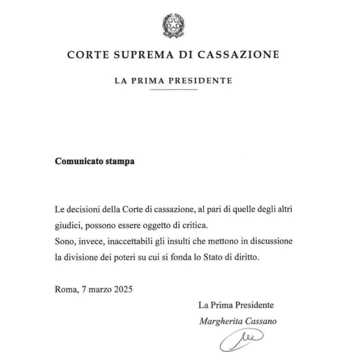 “Le decisioni della Corte di Cassazione al pari di quelle degli altri giudici possono essere oggetto di critica. Sono, invece, inaccettabili gli insulti che mettono in discussione la divisione dei poteri su cui si fonda lo stato di diritto”.