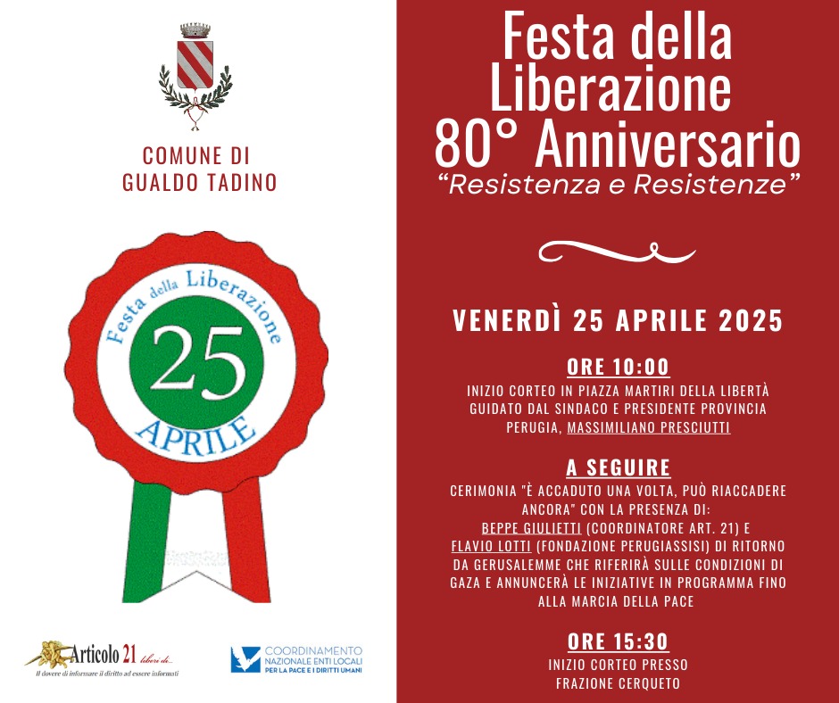 L’Amministrazione Comunale di Gualdo Tadino invita tutti i Cittadini e le Associazioni a partecipare Venerdì 25 aprile 2025 al corteo commemorativo organizzato per celebrare l’80° anniversario della Liberazione che sarà guidato dal Sindaco e Presidente della Provincia di Perugia, Massimiliano Presciutti.