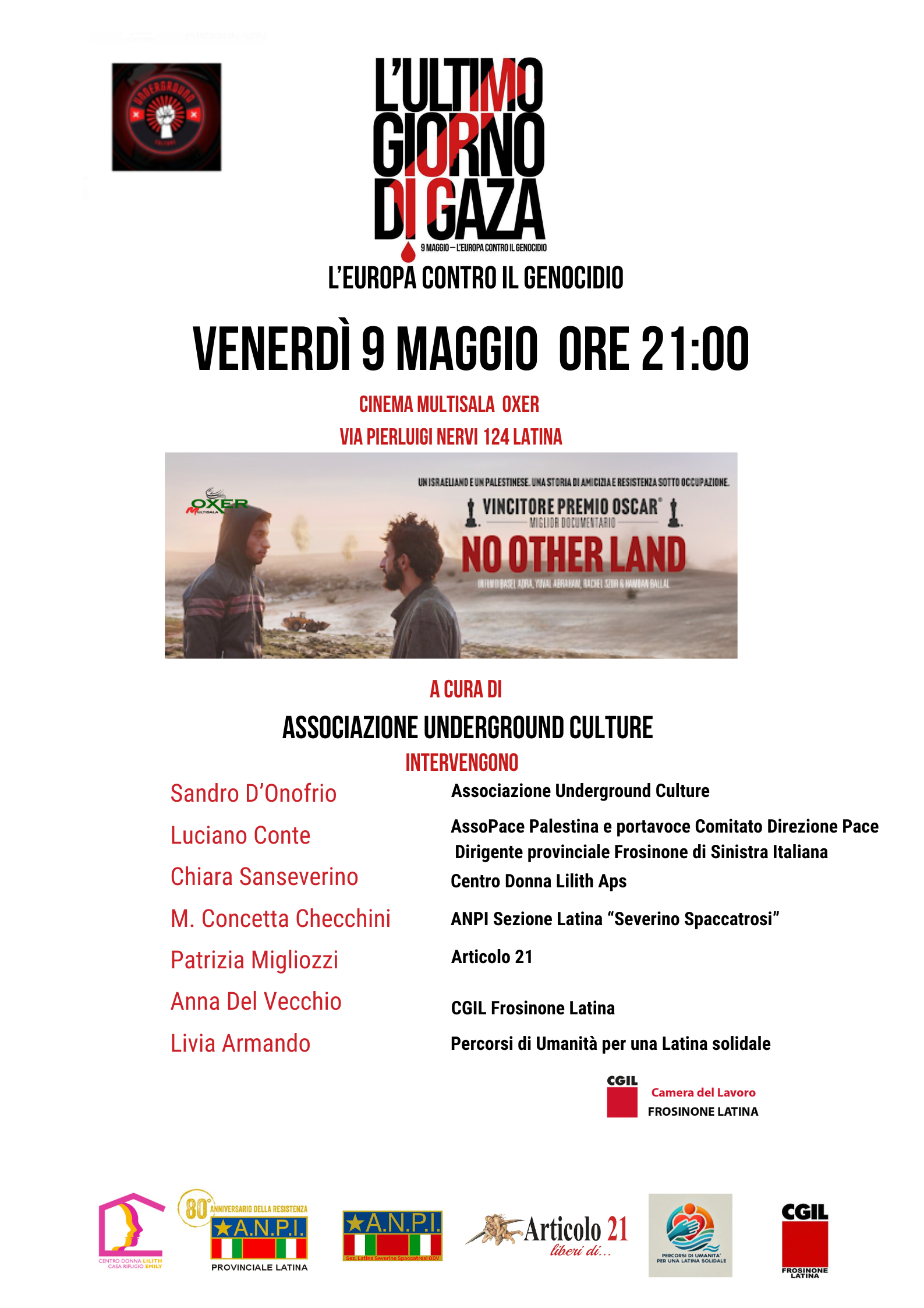 Il prossimo 9 maggio alle ore 21, presso il Cinema Multisala Oxer di Latina, l’Associazione culturale Underground Culture organizza la proiezione del documentario pluripremiato “No Other Land”, vincitore dell’Oscar come Miglior Documentario.