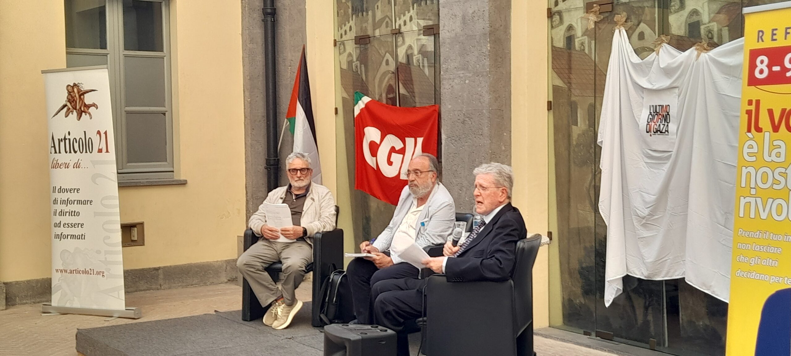 Referendum Decreto Sicurezza Bavaglio all’informazione con Beppe Giulietti, coordinatore Articolo 21, prof. Mauro Volpi Costituzionalista, Attilio Romanelli Segretario provinciale Spi Cgil.