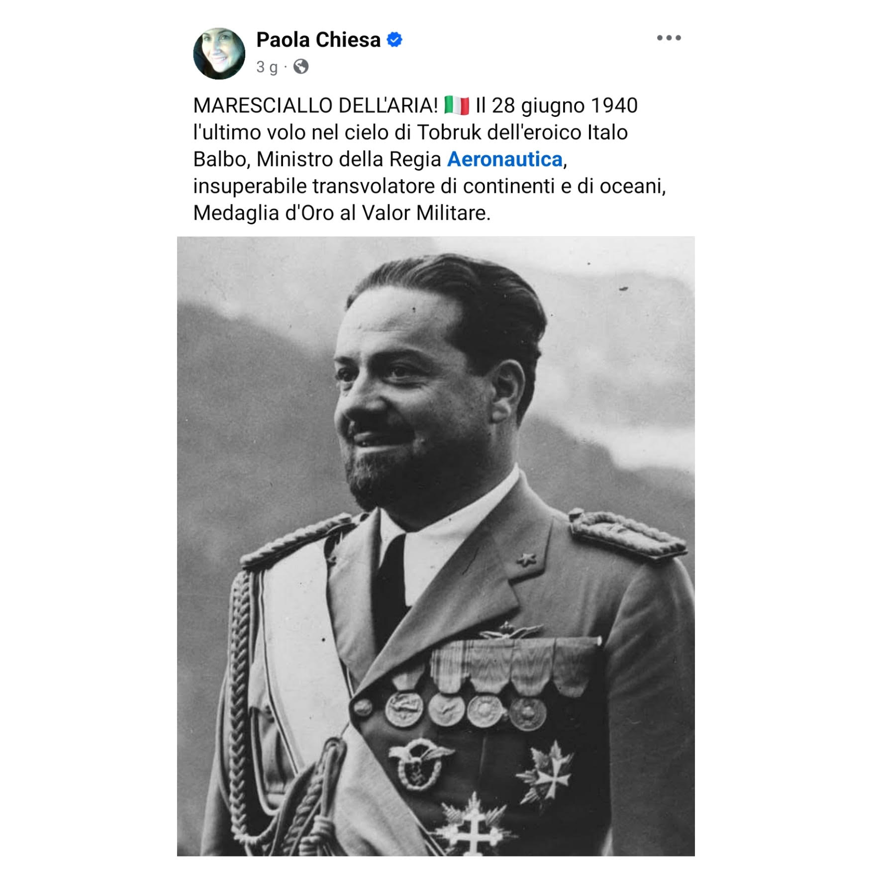 Il 30 giugno, in occasione dell’anniversario della morte di Italo Balbo, la deputata Paola Chiesa ha pubblicato sui suoi profili social un’immagine celebrativa del gerarca fascista. Fin qui nulla di nuovo, anzi: per Chiesa, Balbo è una figura eroica da omaggiare regolarmente, uno degli idoli del pantheon neofascista di Fratelli d’Italia. Ma c’è un dettaglio che rende questo episodio particolarmente rivelatore. La foto scelta dalla parlamentare, un elegante bianco e nero, mostra Balbo in posa al Berghof, la residenza alpina di Hitler. O meglio: mostra Balbo, senza Hitler. L’immagine, infatti, è un ritaglio di uno scatto ben più noto – quello del 1938 – in cui Balbo è ritratto accanto al Führer.
