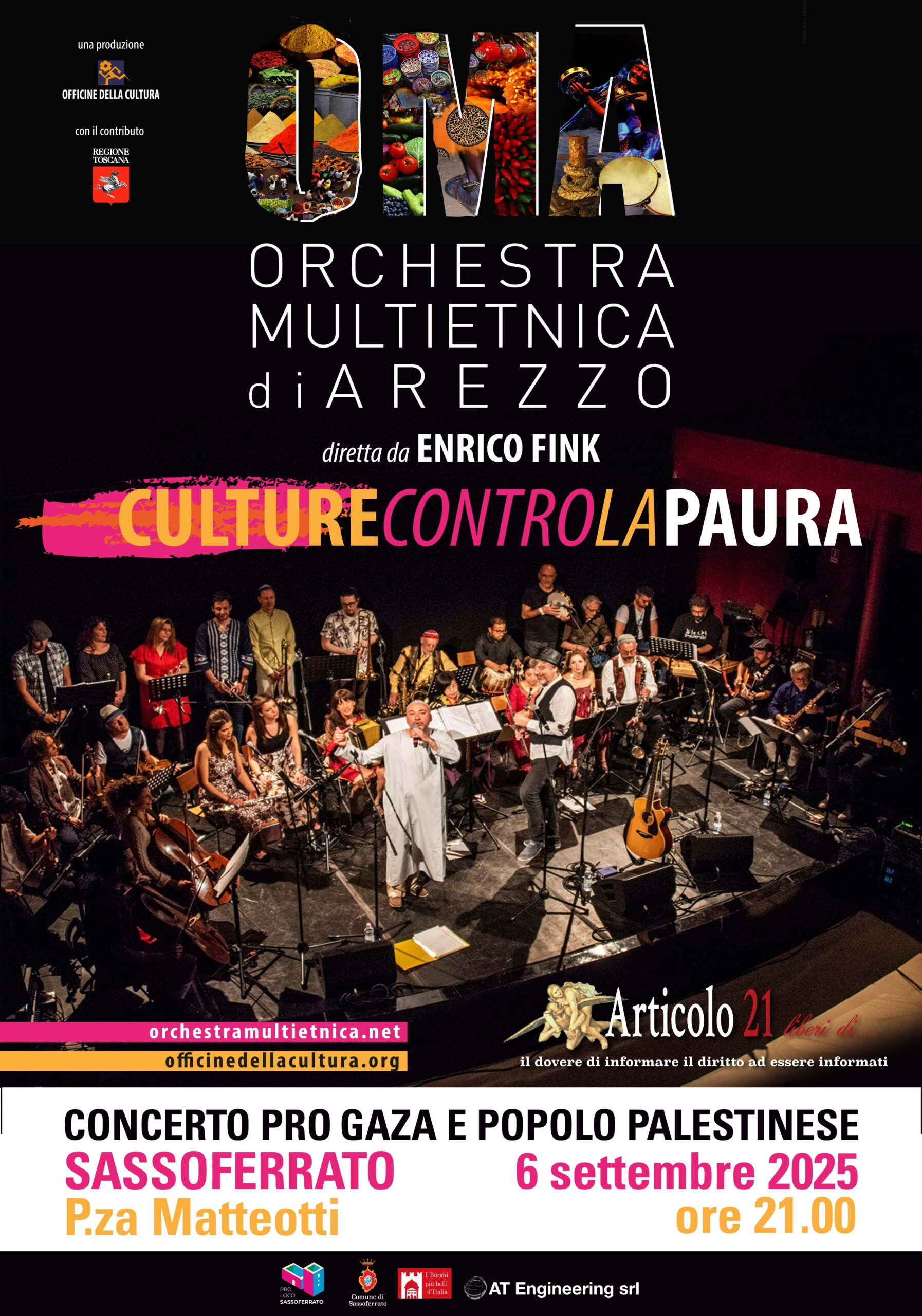 Stante l’acuirsi e l’imbarbarimento della situazione di Gaza e di tutto il popolo palestinese, anche noi abbiamo voluto denunciare ciò, coinvolgendo l’Orchestra Multietnica Arezzo dove convivono artisti di varie nazioni, religioni e culture in modo creativo, dimostrando che questo è possibile ed auspicabile tra uomini di buona volontà.