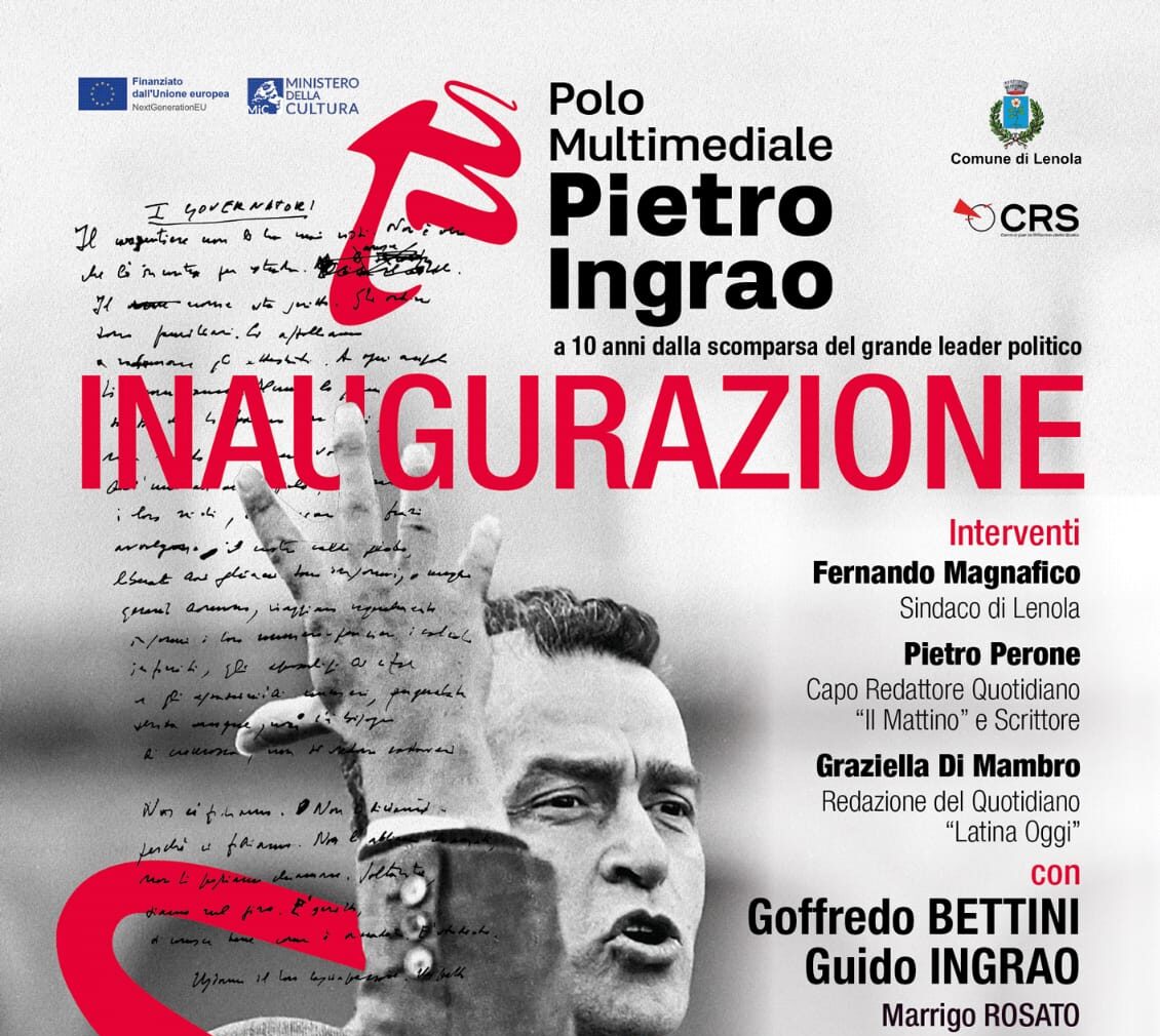 Sabato 8 novembre dunque a Lenola (in via Nucleo Abitato Passignano 39, alle 15.30) è prevista l’inaugurazione del «Polo Multimediale Pietro Ingrao», finanziato dall’Unione Europea. L’iniziative è promossa da Ministero della Cultura, Comune di Lenola e CRS; nel pomeriggio sono previsti interventi del sindaco di Lenola Fernando Magnafico, dei giornalisti Pietro Perone e Graziella Di Mambro, con la partecipano, fra gli altri, di Marrigo Rosato, Goffredo Bettini e Guido Ingrao e letture di Pier Giulio Cantarano.