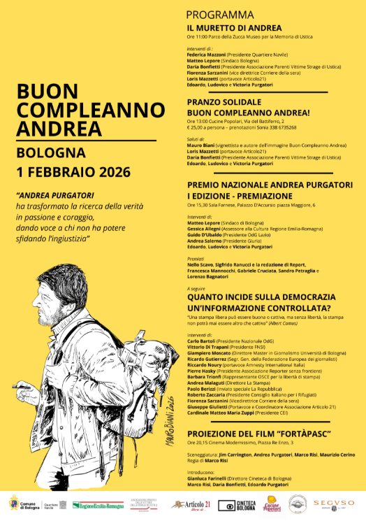 Il primo febbraio a Bologna la giornata dedicata ad Andrea Purgatori, scomparso il 19 luglio 2023. “Buon compleanno Andrea”, con la cerimonia di premiazione della prima edizione del “Premio Nazionale Andrea Purgatori” istituito dai figli Edoardo, Ludovico e Victoria in ricordo del padre, con lo slogan: “Un professionista onesto” per celebrare il giornalismo d’inchiesta, il rigore professionale e l’indipendenza intellettuale. “Nostro padre ha sempre cercato, con ogni mezzo, di portare alla luce ciò che altri cercavano di nascondere. Questo premio è il nostro modo per continuare quella missione”.