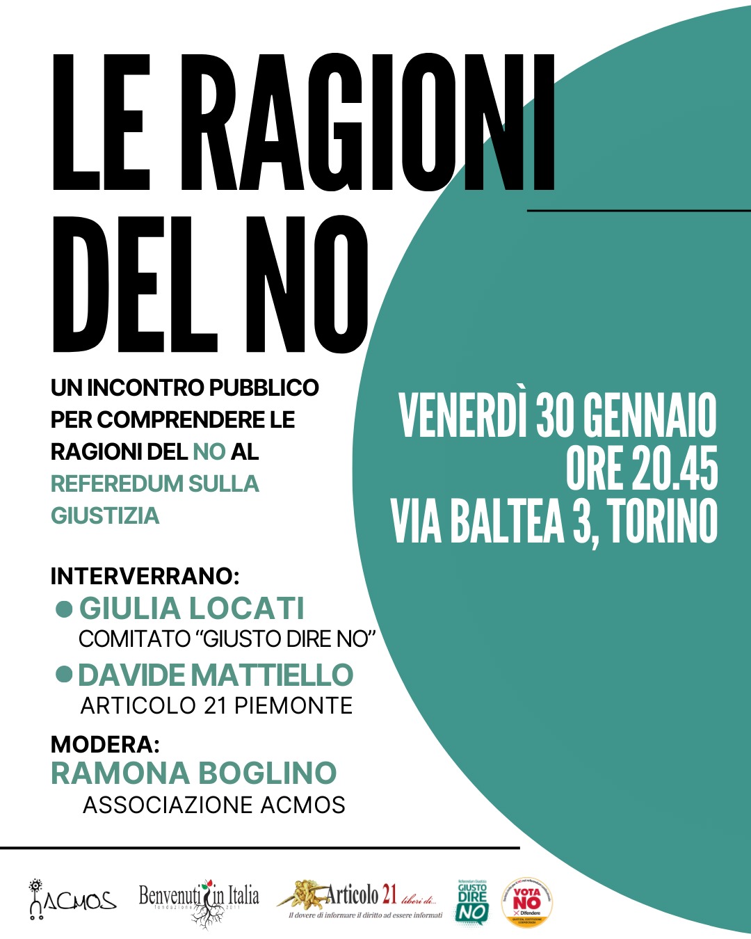 Venerdì 30 gennaio le ragioni del “no” al referendum sulla giustizia verranno illustrate nel corso di un incontro organizzato da Acmos, Benvenuti in Italia e Articolo 21 insieme ai comitati per il No (ore 20.45, via Baltea 3).