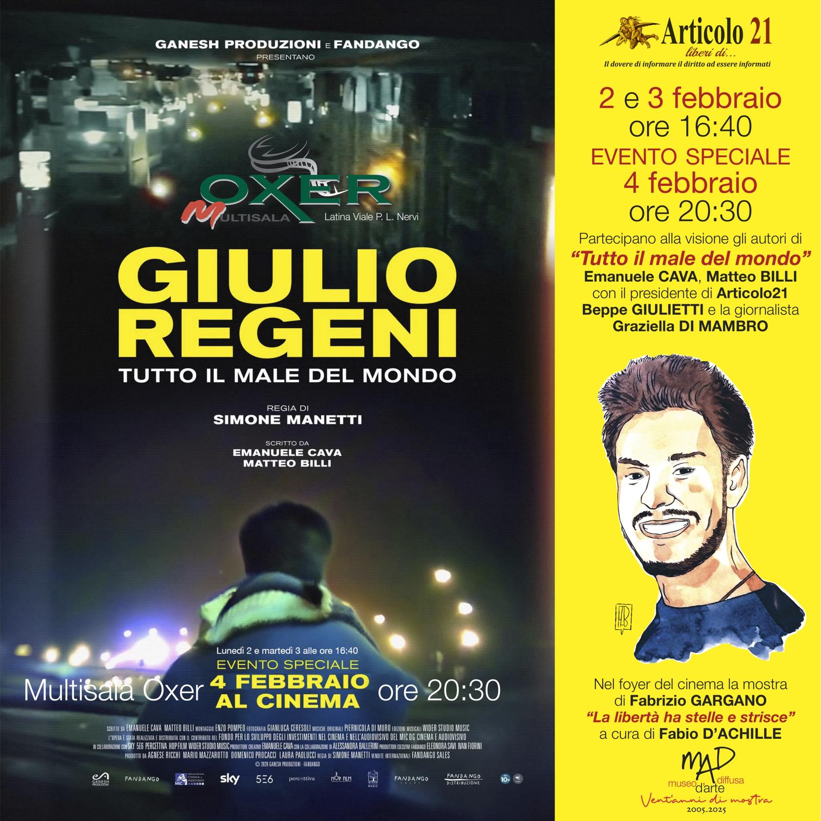 Tre giorni dedicati a una storia a tratti incredibile, feroce, sentimentale e ancora incompiuta, quella di Giulio Regeni. Il 2 e 3 febbraio (alle 16.40) alla multisala Oxer di Latina verrà proiettato il film “Giulio Regeni, tutto il male del mondo” , scritto da Emanuele Cava e Matteo Billi che saranno anche presenti alla proiezione evento del 4 febbraio (alle 20.30 sempre al cinema Oxer di Latina) ed alla quale parteciperà il coordinatore nazionale di Articolo 21 Beppe Giulietti insieme alla responsabile legalità di Articolo 21, Graziella Di Mambro.