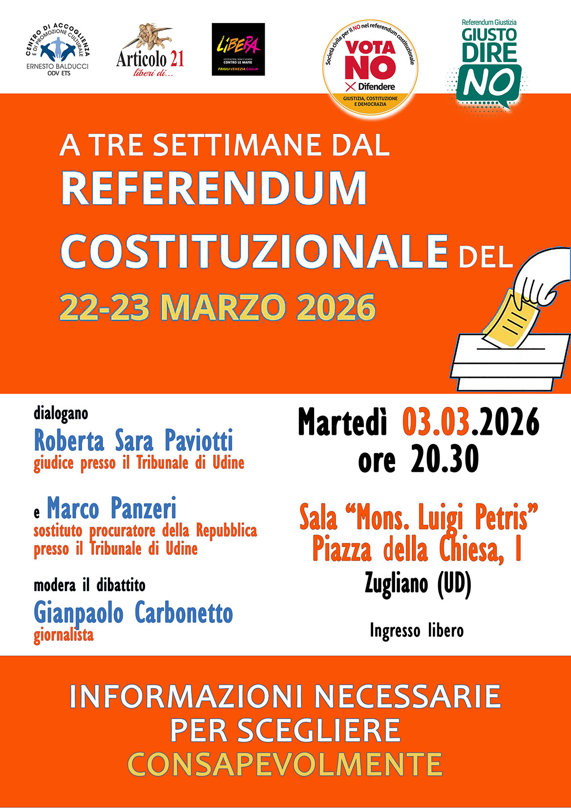 Il Centro “Ernesto Balducci” di Zugliano (UD), unitamente ad Articolo 21 Fvg e a Libera – Associazioni, Nomi e Numeri contro le mafie Fvg, ha promosso in queste settimane tre incontri per indagare le ragioni del “No” al Referendum costituzionale sulla giustizia, che ci vedrà alle urne il 22 e 23 marzo pp.vv., e ribadire quanto la riforma non punti realmente all’efficienza dei tribunali, ma metta in discussione l’equilibrio dei poteri e la tenuta stessa della democrazia.
