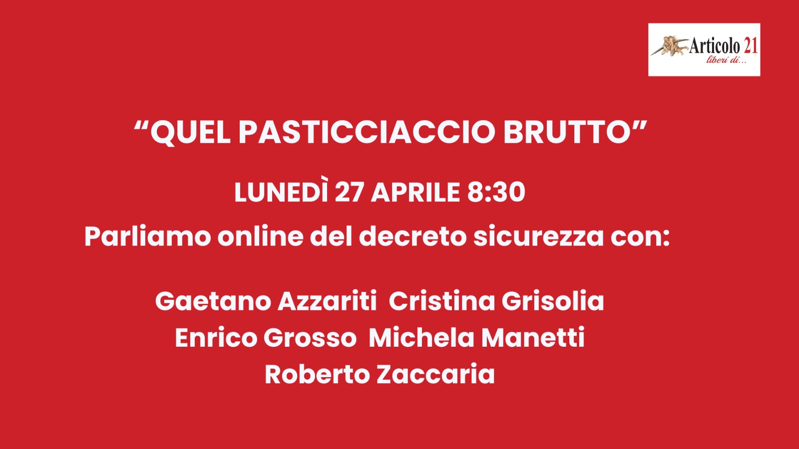 Articolo 21 torna a parlare del decreto sicurezza e del perché era e resta un pericoloso attacco alla Costituzione, ai diritti civili e alla democrazia. Vergognoso è certamente il (misero) premio agli avvocati che aiutano i rimpatri ma altrettanto grave è l’aver voluto reiterare il principio nonostante i rilievi del Presidente della Repubblica Sergio Mattarella. Il tema sarà al centro dell’incontro settimanale di Articolo 21 di lunedì 27 aprile.