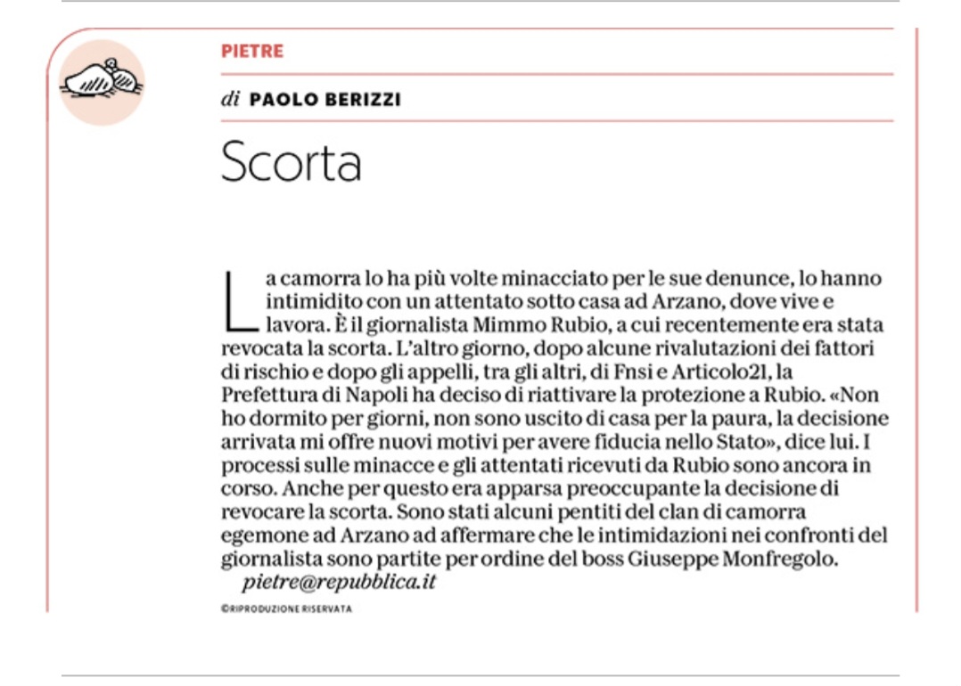 La camorra lo ha più volte minacciato per le sue denunce, lo hanno intimidito con un attentato sotto casa ad Arzano, dove vive e lavora. E’ il giornalista Mimmo Rubio, a cui recentemente era stata revocata la scorta. L’altro giorno, dopo alcune rivalutazioni dei fattori di rischio e dopo gli appelli, tra gli altri, di Fnsi e Articolo 21, la Prefettura di Napoli ha deciso di riattivare la protezione a Rubio. “Non ho dormito per giorni, non sono uscito di casa per la paura, la decisione arrivata mi offre nuovi motivi per avere fiducia nello Stato”, dice lui. I processi sulle minacce e gli attentati ricevuti da Rubio sono ancora in corso. Anche per questo era apparsa preoccupante la decisione di revocare la scorta. Sono stati alcuni pentiti del clan di camorra egemone ad Arzano ad affermare che le intimidazioni nei confronti del giornalista sono partite per ordine del boss Giuseppe Monfregolo”.