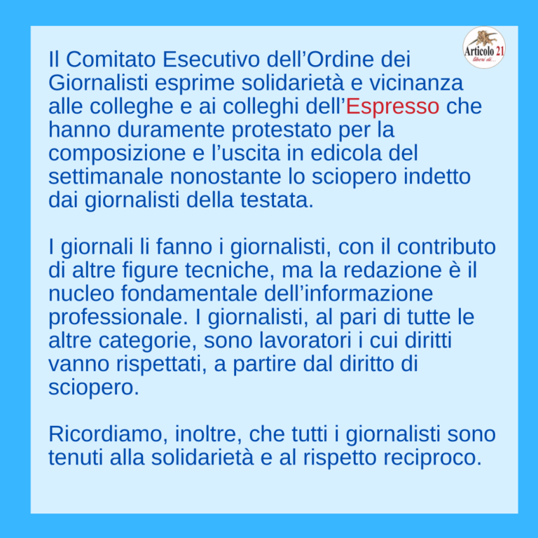 In merito alla vertenza che coinvolge i giornalisti de L'Espresso, il Comitato Esecutivo del Consiglio nazionale dell'Ordine oggi ha espresso non solo la solidarietà alle...
